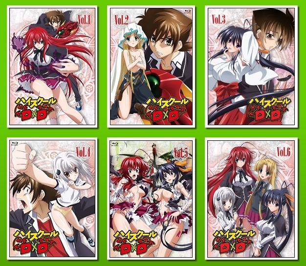 All six Region 1 DVD and Blu-ray compilation volume covers of High School DxD