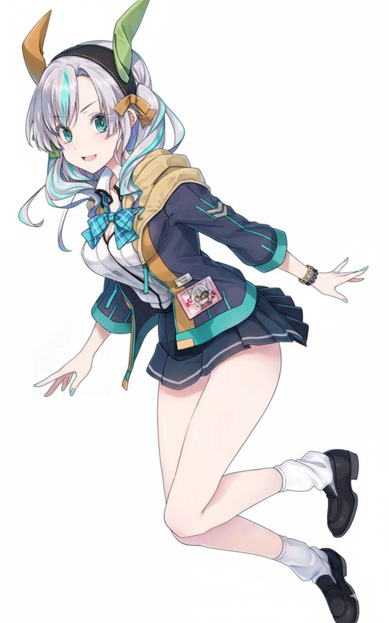 Schwertleite is a beautiful young girl with silver hair with teal stripes and teal eyes. She wears the Kuoh Academy’s uniform with a black skirt and blue ribbon. She also wears a black sweater mixed with beige and teal.